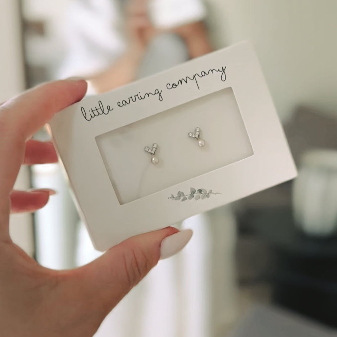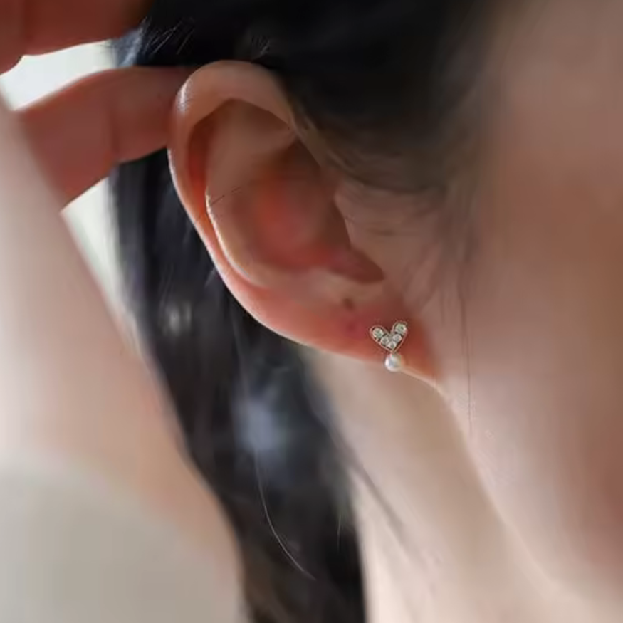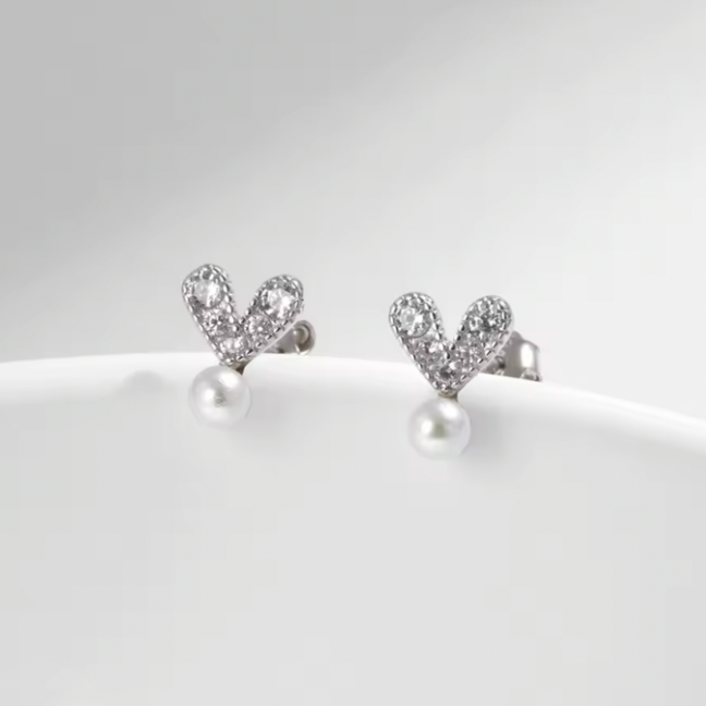 Beautiful sterling silver studs with a heart fixing and pearl detail. The hearts are beautifully sprinkled with a cluster of sparkling crystals which catch the light