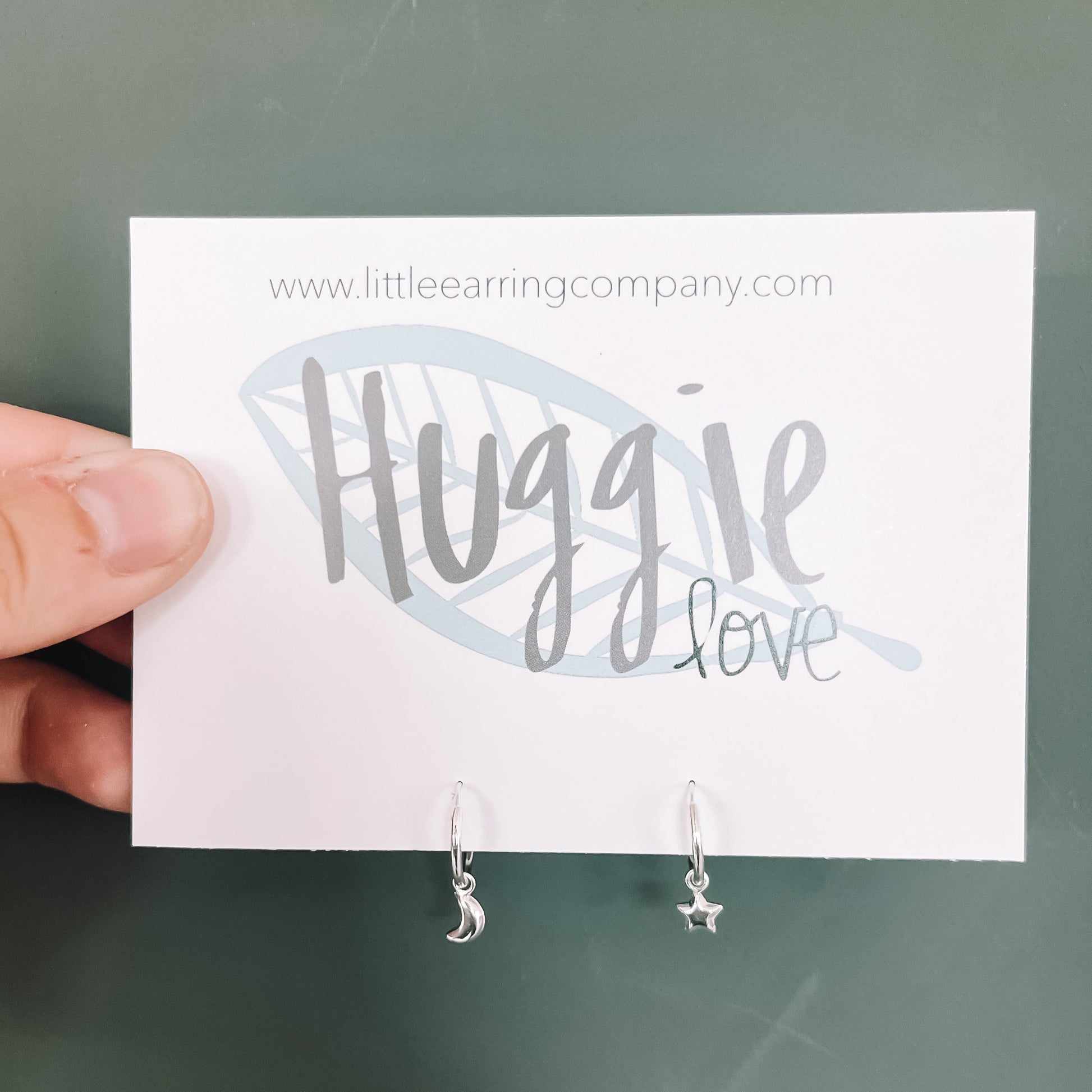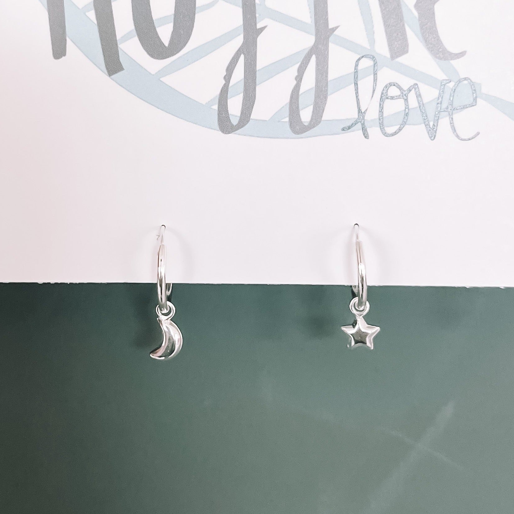 925 sterling silver pair of huggies with one moon charm and one star charm