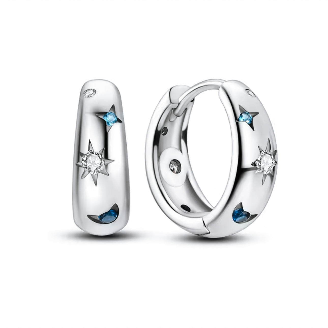 925 sterling silver pair of hoops with mini star, moon and sun detail in crystal and blue diamante