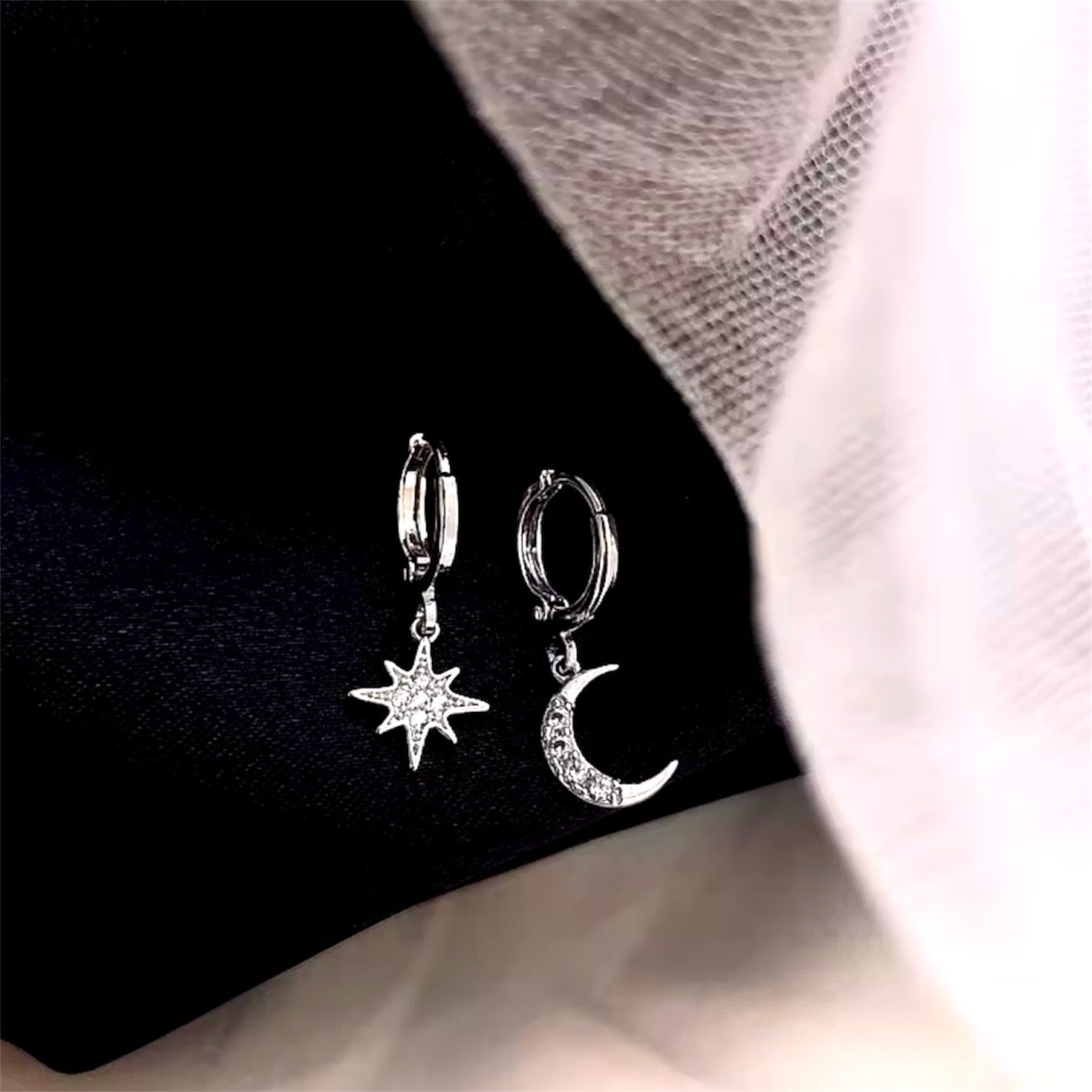 Beautiful 925 sterling silver pair of huggies with star and moon charms and crystal details