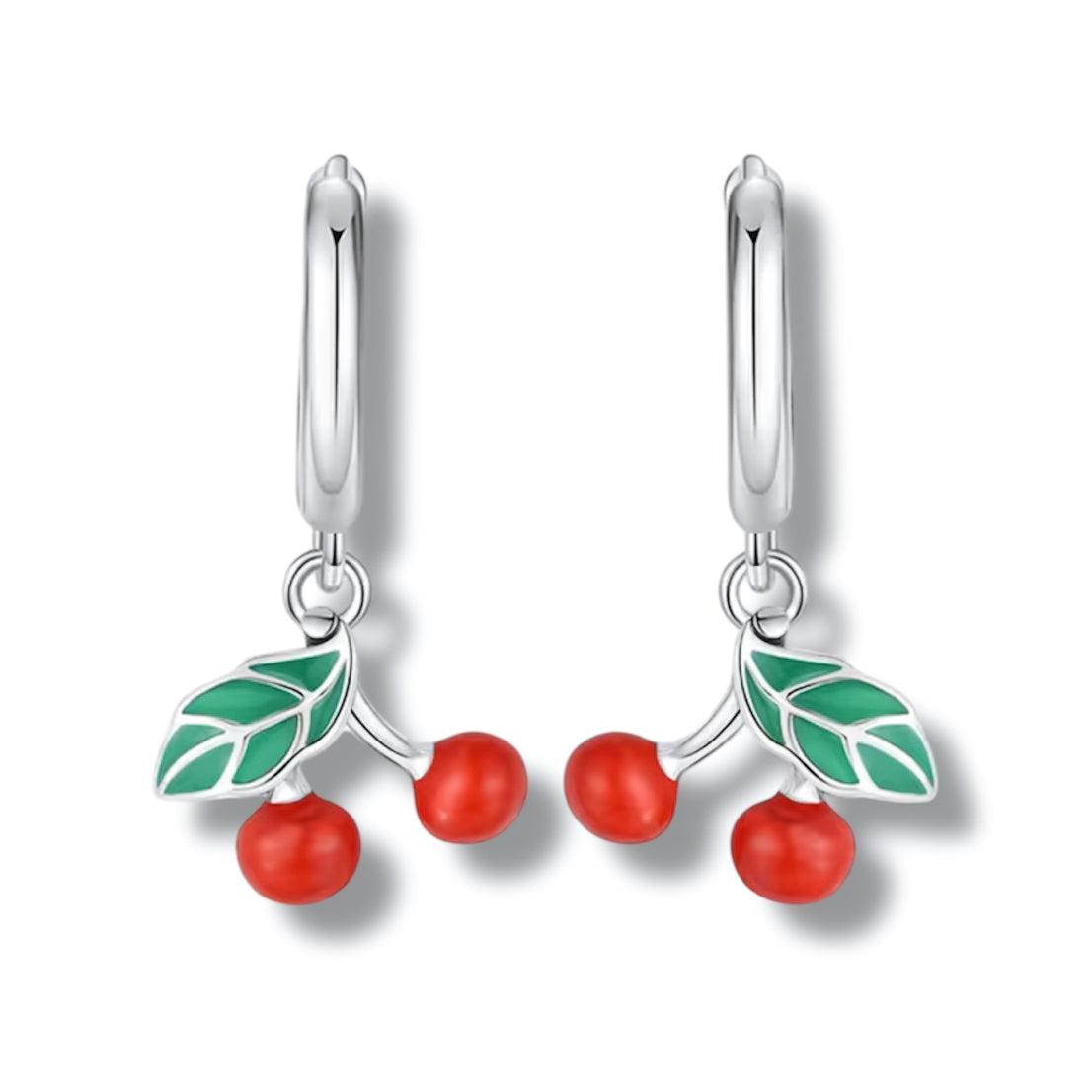 925 sterling silver pair of huggies with red cherry pendant with green leaves